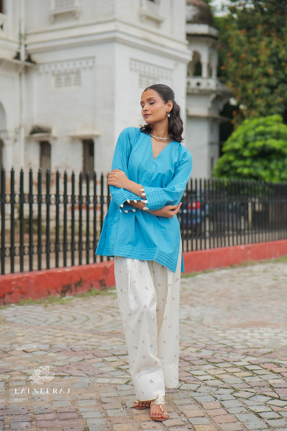 Paired with an off-white printed Farshi salwar adorned with delicate all-over motifs and a broad hem, this ensemble creates a graceful silhouette while offering ease of movement. Made from soft, breathable cotton, it’s perfect for festive mornings, casual brunches, office days, or relaxed family gatherings.