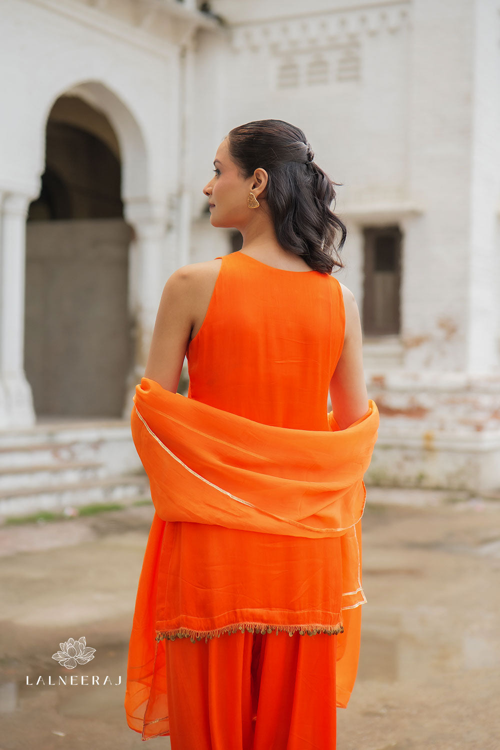 Step into timeless grace with the Sunehri solid Farshi Salwar Set from Lalneeraj. This vibrant tangerine-orange ensemble features a sleeveless straight-cut kurta with delicate tassel edging at the hem, paired with a voluminous Farshi salwar and a lightweight organza dupatta highlighted with subtle gold gota lace.